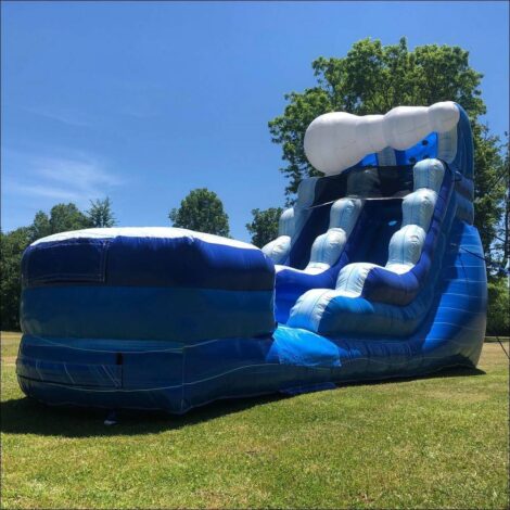 The first, two-story water slides that let kids decide from what height they want to slide down. Climb up the ladder and stop at the first platform or continue 3½ feet higher and slide down the second. No matter which they choose they end up whipping around the turn and splashing into a pool of water. This ride requires a constant source of water from a hose connection (hose NOT provided).